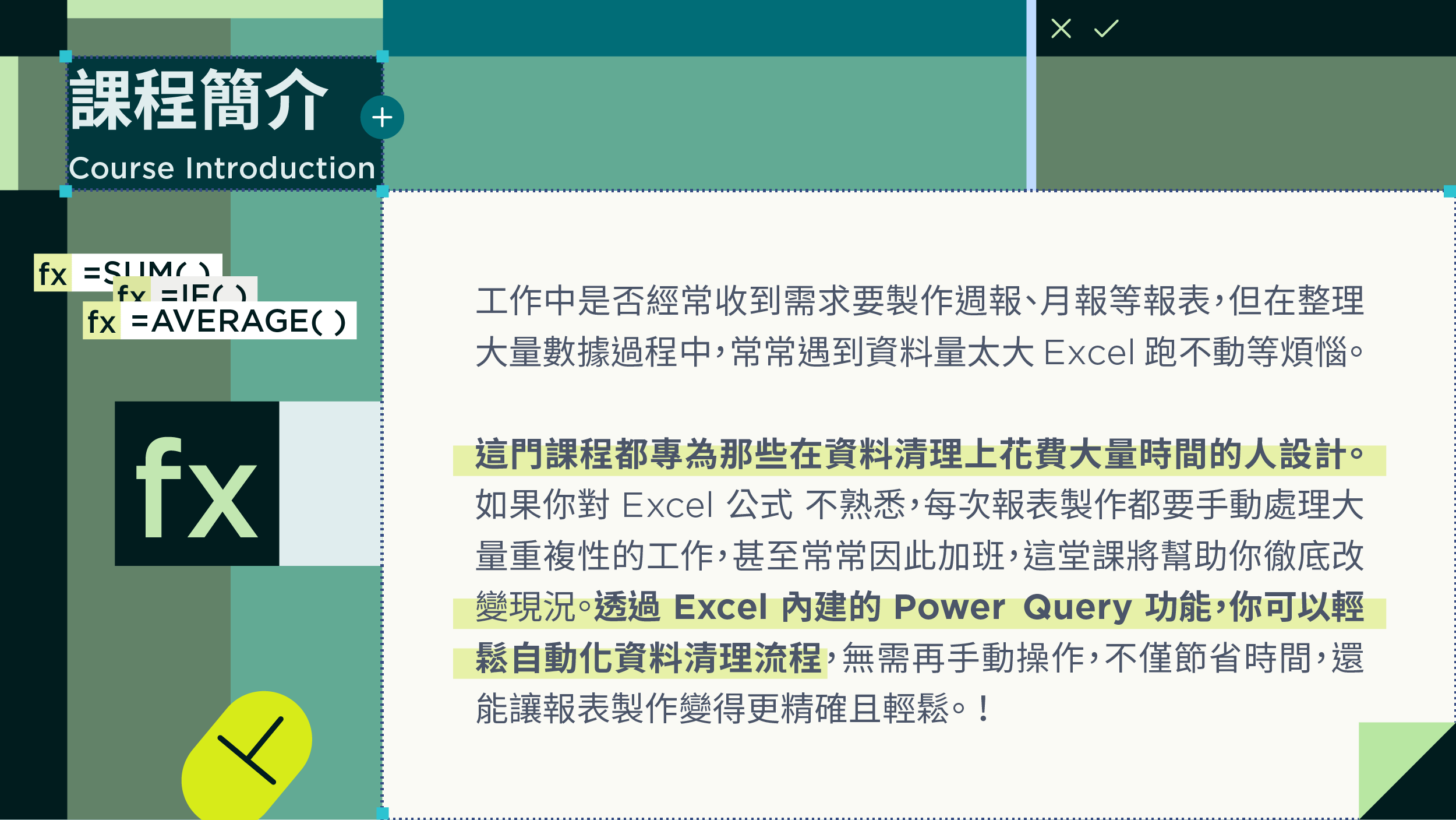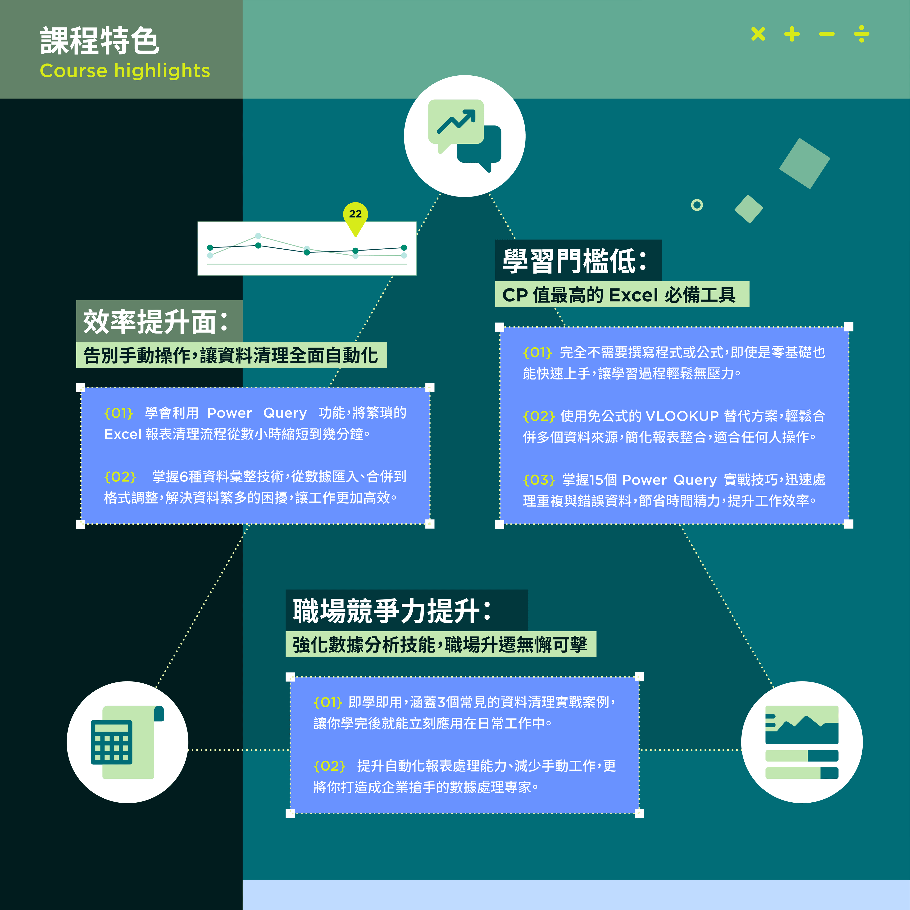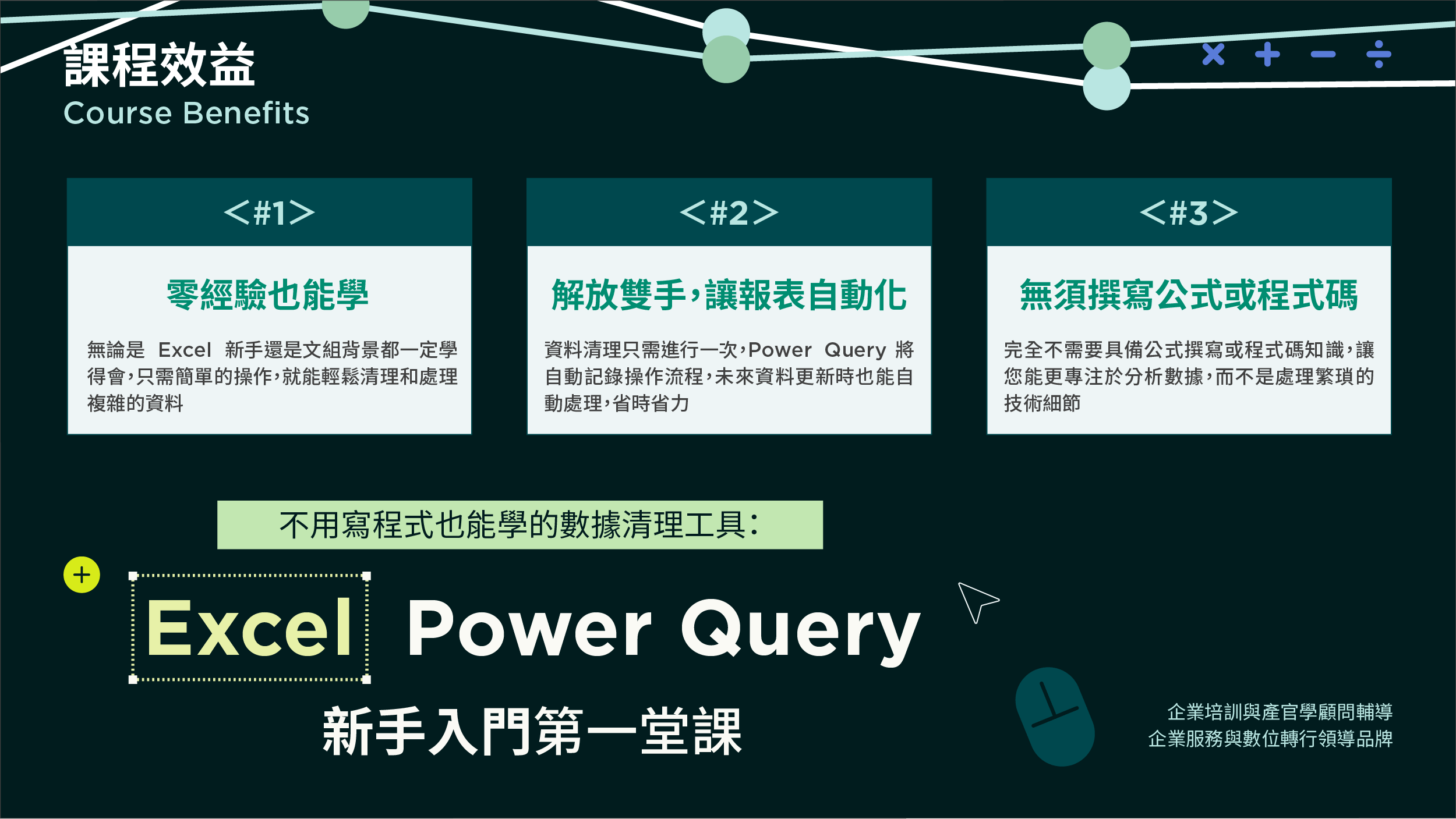 透過 Power Query 的強大功能,只需幾個簡單的步驟,就能自動化處理複雜的數據清理任務。這意味著你可以把精力集中在數據分析和決策上,而不浪費時間在技術細節或學習程式語言上。這樣的無壓力學習方式,適合需要快速提升 Excel 能力的學員,讓工作效率倍增。