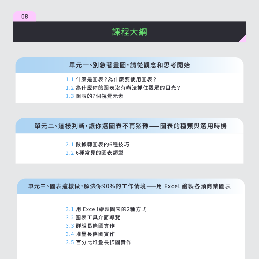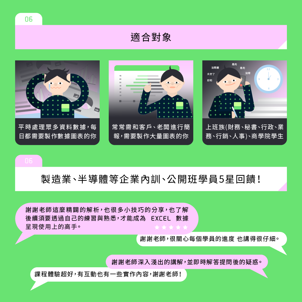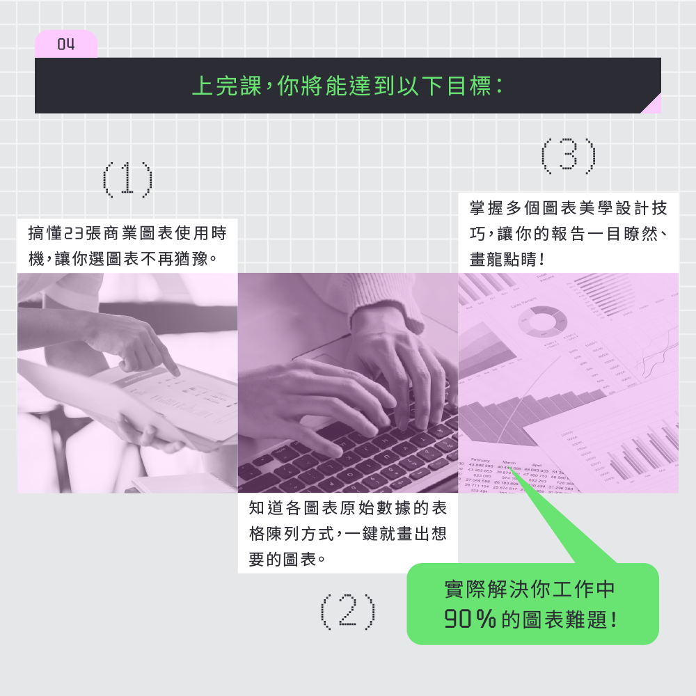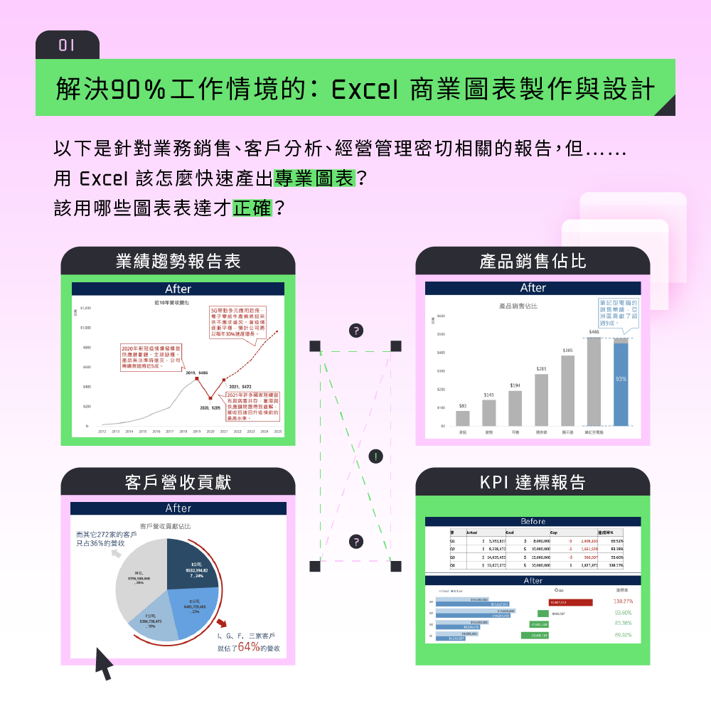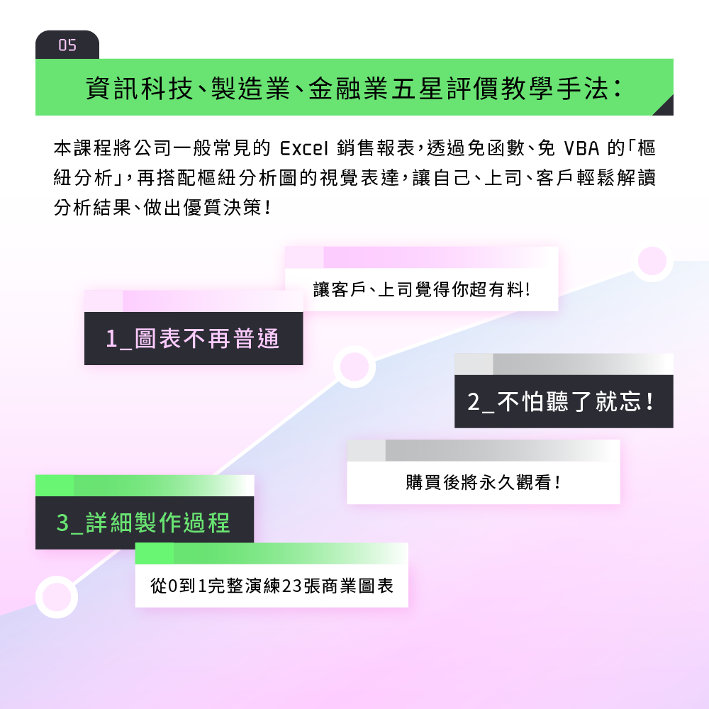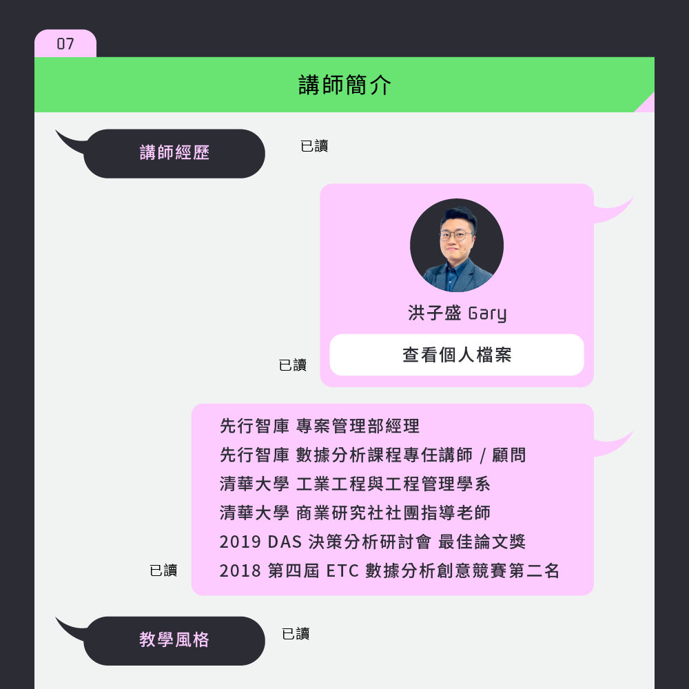 擅長從客戶的問題出發,以終為始,設計客製化的數據分析課程。搭配情境式、主題式、漸進式的教學手法,用系統化的方式協助解決資源彙整、數據清理、視覺化、分析手法等問題。滿足客戶業務和商業的需求,建立數據驅動的文化。