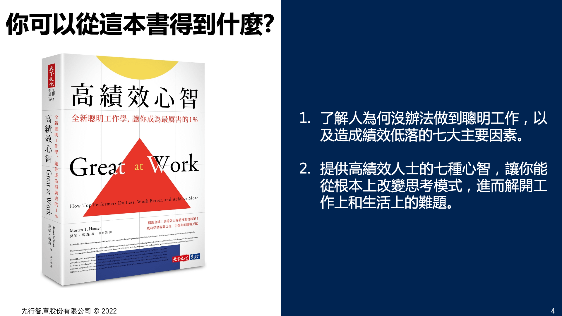 高績效的關鍵,從來不是把事情做更多,而是把力氣用在真正重要的地方。《高績效心智:全新聰明工作學》帶你拆解頂尖表現者的工作邏輯與思考模式,學會如何聚焦關鍵任務、有效排序優先順序,讓產出更集中、更有影響力。透過經驗與實證整理出的核心心智策略,幫助你在團隊合作與工作表現上全面升級。只要 40 分鐘,就能重新理解什麼叫「把工作做好」,為你的職場表現開啟全新可能。